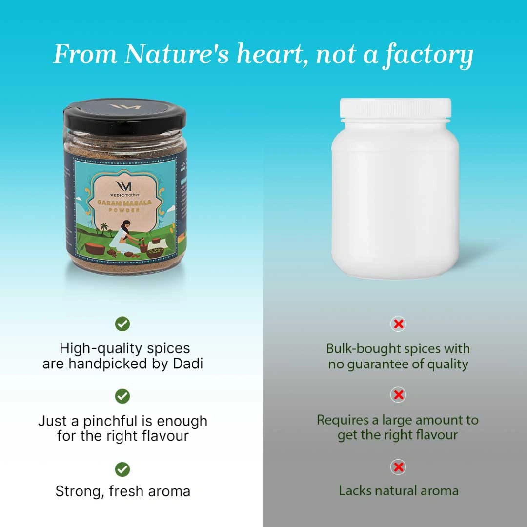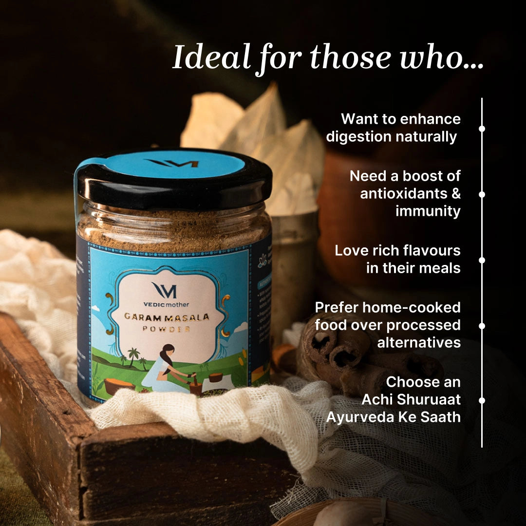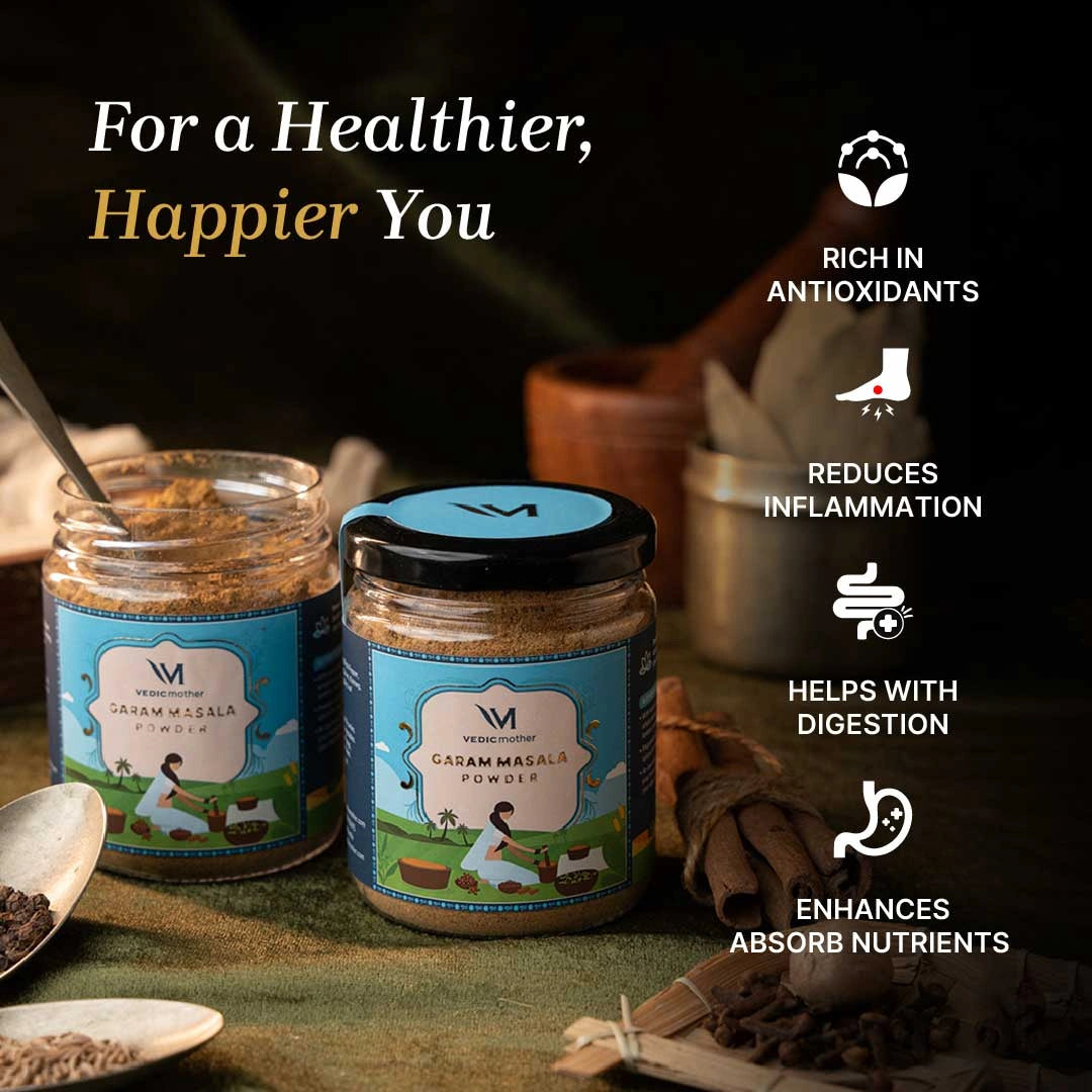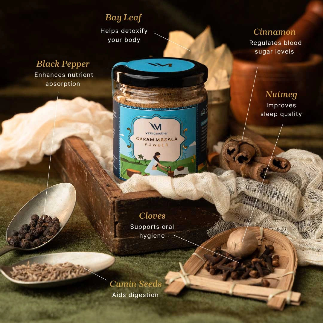 Vedic Mother’s Garam Masala is a blend of high-quality, organic spices that not only enhance flavour but also offer various health benefits. Spices like cumin, coriander, and cardamom are known for their antioxidant, anti-inflammatory, and digestive properties.
