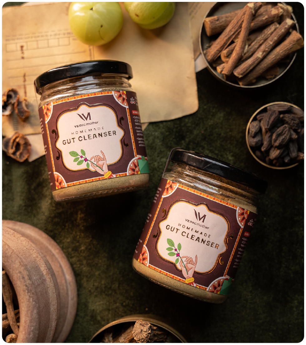 β The Gut Cleanser is your solution to digestive issues with an Ayurvedic blend of 20+ herbs like Triphala, Ashwagandha, Brahmi, and Giloy. It cleanses your gut and helps with headaches, joint pain, and bone health.
