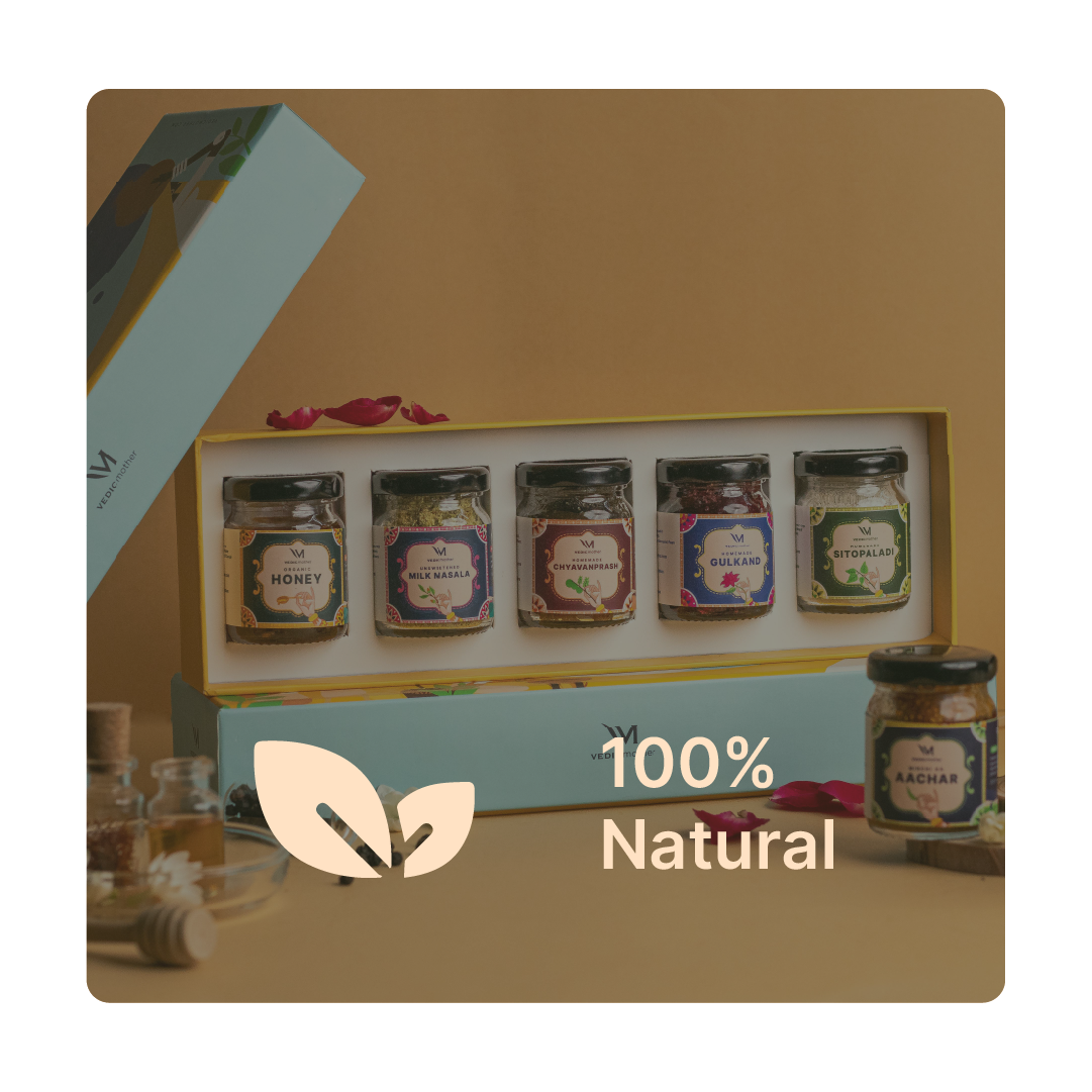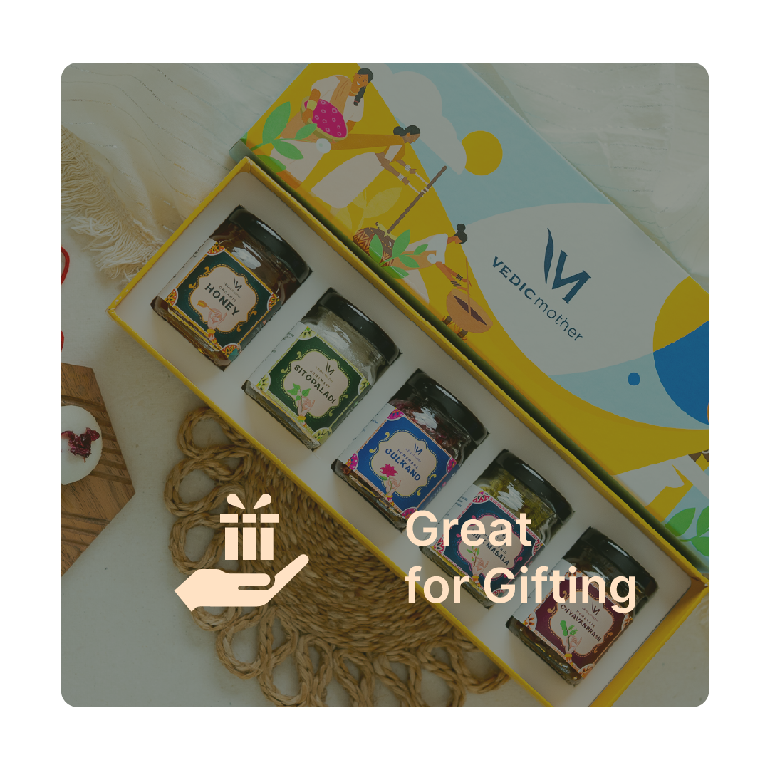 The box contains five mini glass jars filled with a selection of our Ayurvedic essentials, such as Chyavanprash, Gulkand, Honey, Shikanji Masala, and more. The contents may vary based on availability.